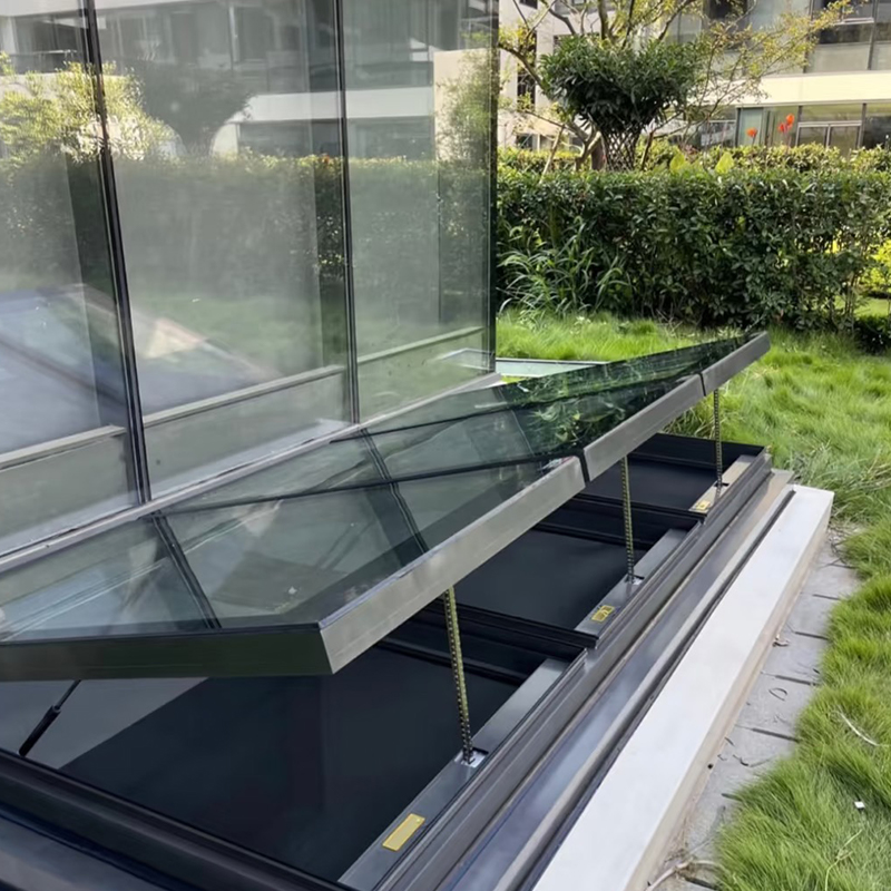 The aluminum alloy electric skylight integrates a silent, low-vibration motorized drive system with a smart control platform supporting remote handset, smartphone application, and voice assistant operation, enabling convenient control from anywhere inside or outside the building.
